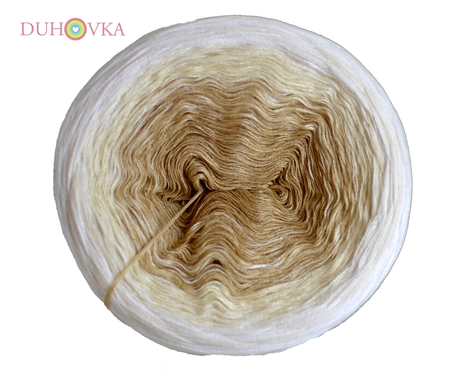 Duhovka je jemná směsová příze s postupnými barevnými přechody. Je vhodná pro čepičky, šaty, sukně, šátky, tuniky, deky a také originální dekorace :)   Barvy: béžová, smetanová, bílá - 4-nitka Přívěšek se může lišit   Složení: 50% bavlna/50% akryl   Návin: 200 metrů / 54 g 250 metrů / 67 ... celý popis