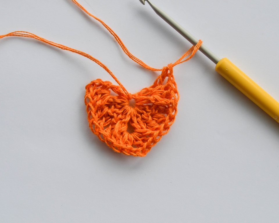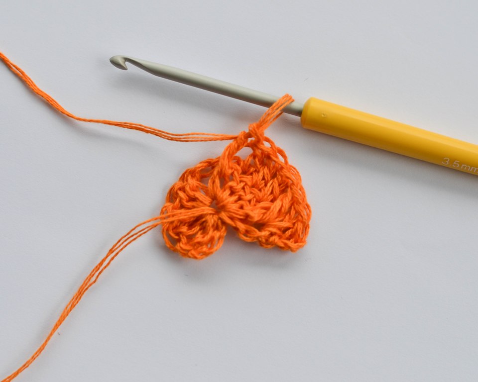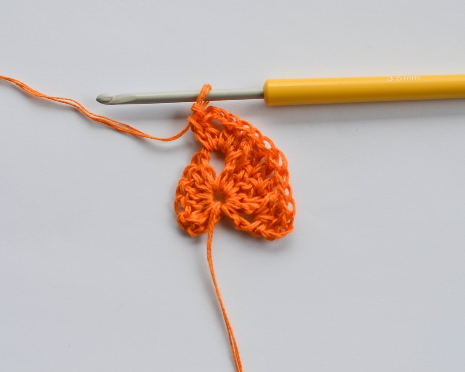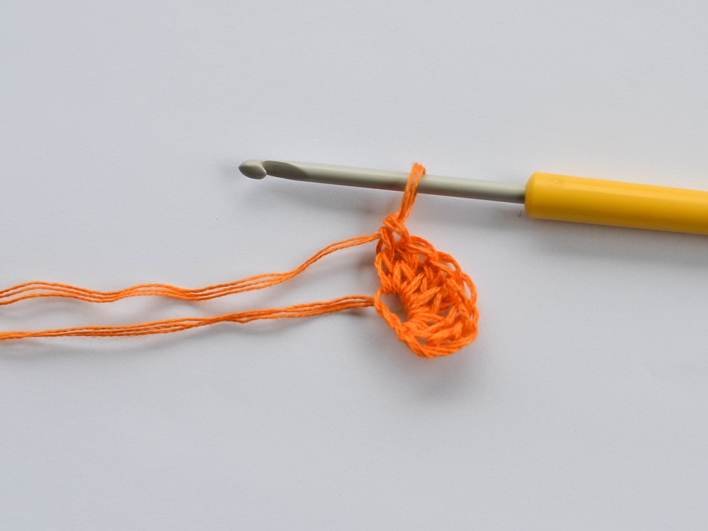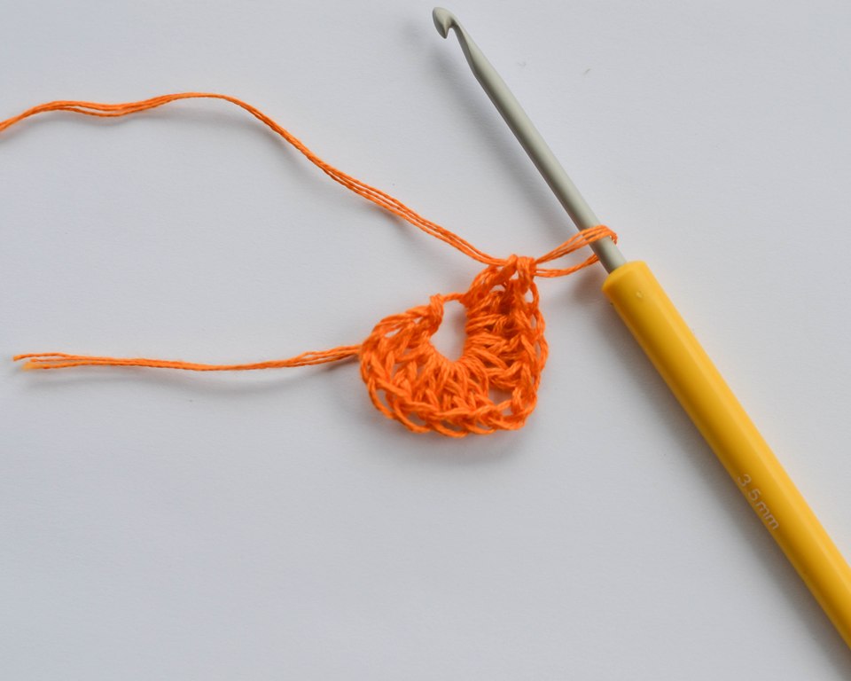 Uděláme si magický kroužek, poté 4 řo a do kroužku 5 DS + 2řo + 5 DS + 1 řo + 1 DS