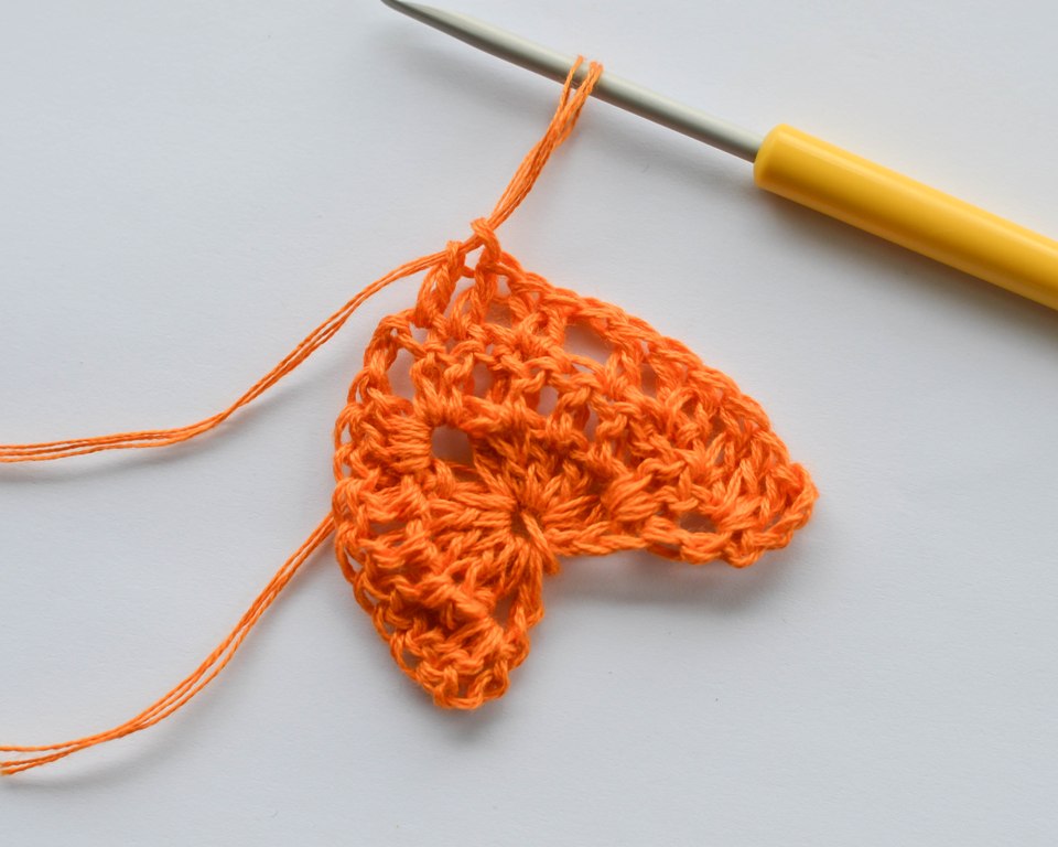 4 řo, 2 DS do dírky, 1 PRDS, 3 DS, 1 PRDS, 1 DS, 1 řo (přeskočíme oko), 1 DS, 1 PRDS, 3 DS, 1 PRDS