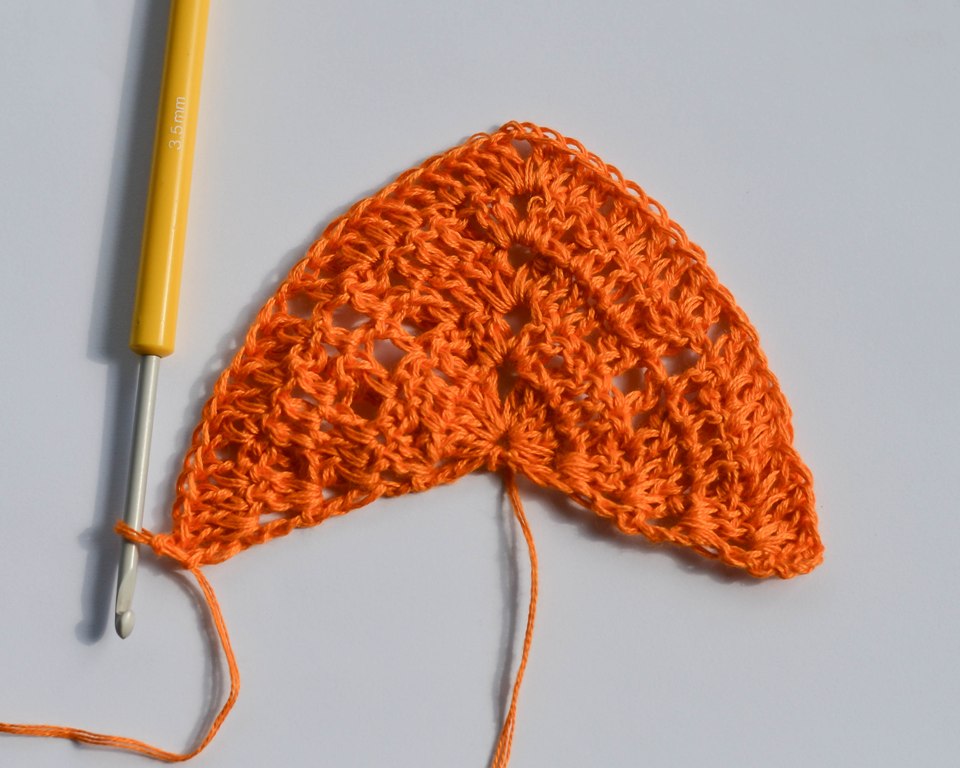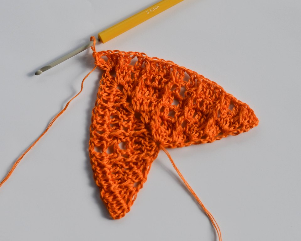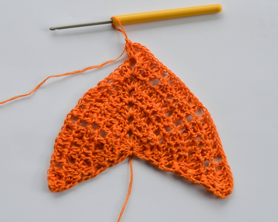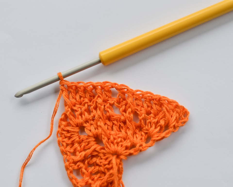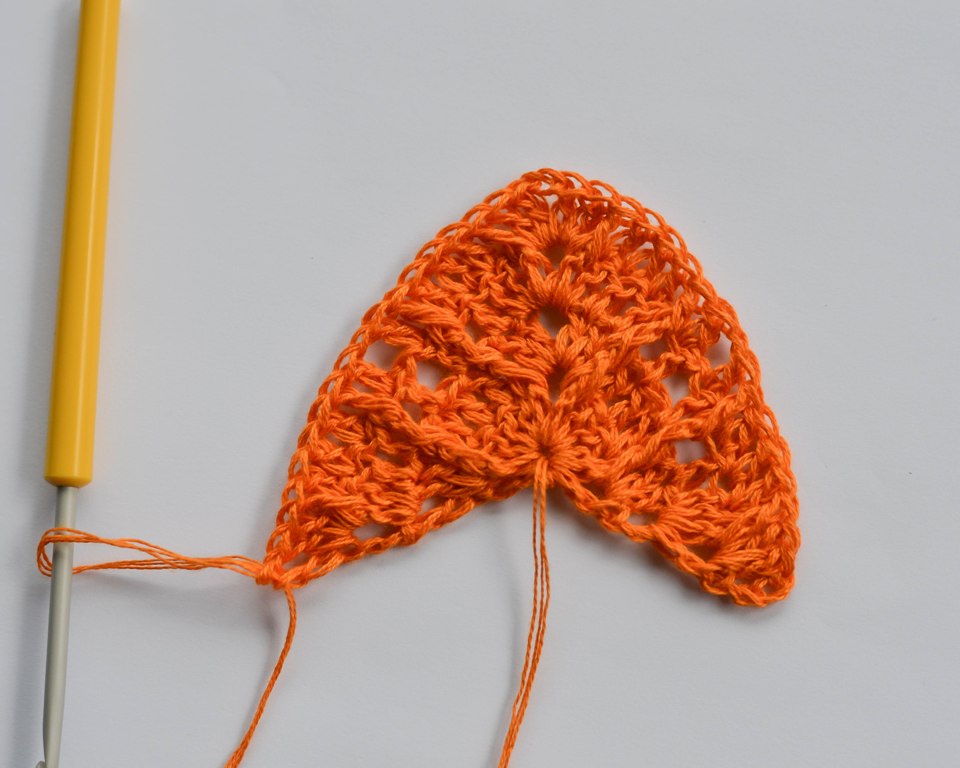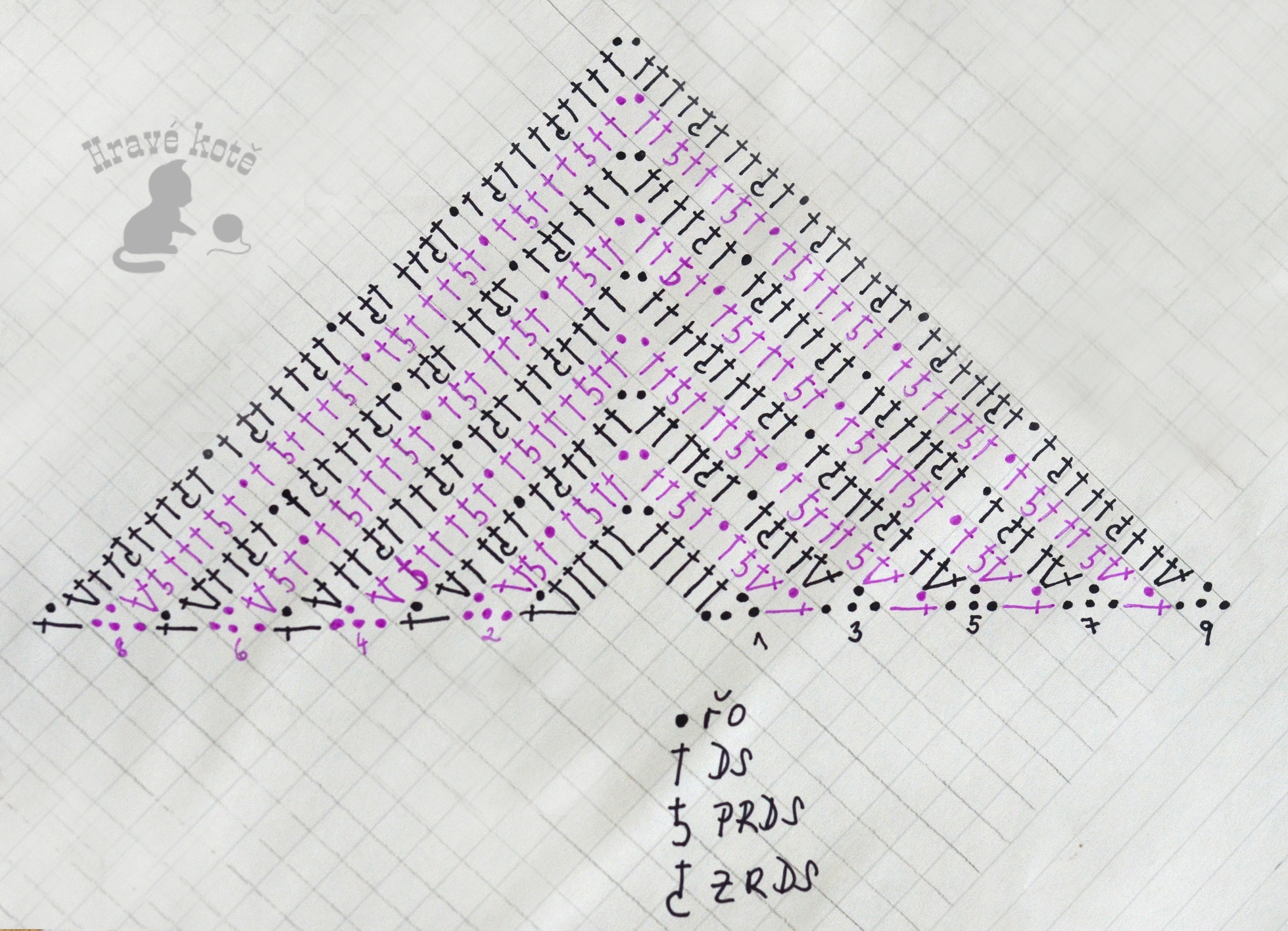 1 PRDS, 1 DS, 1 řo (přeskočit jedno oko), 1 DS, 1 PRDS, 2 DS do řo z předchozí řady, 1 řo, 1 DS