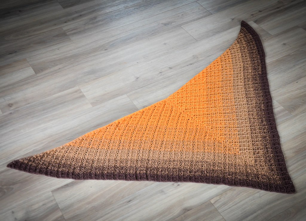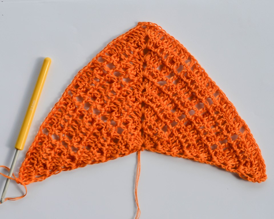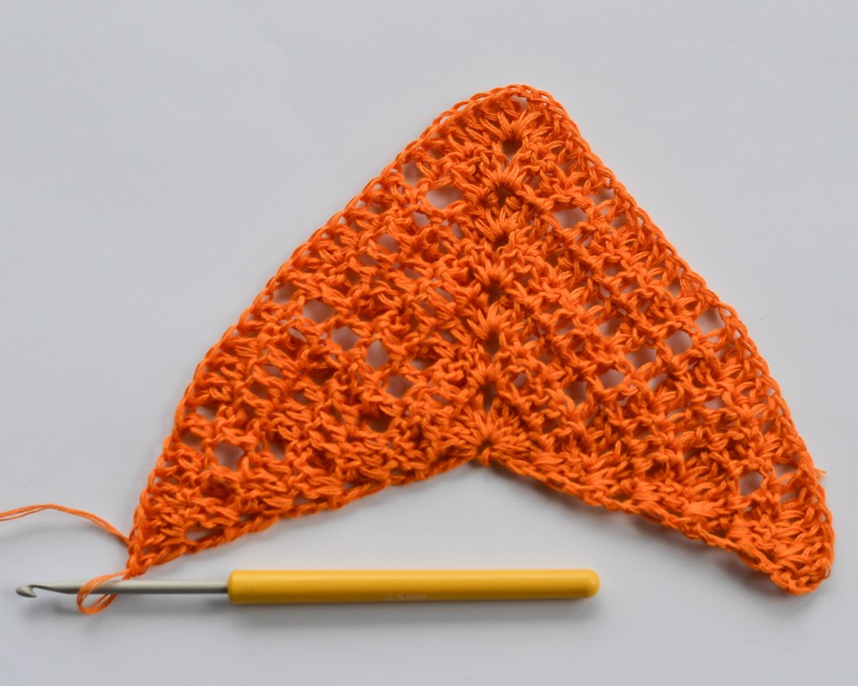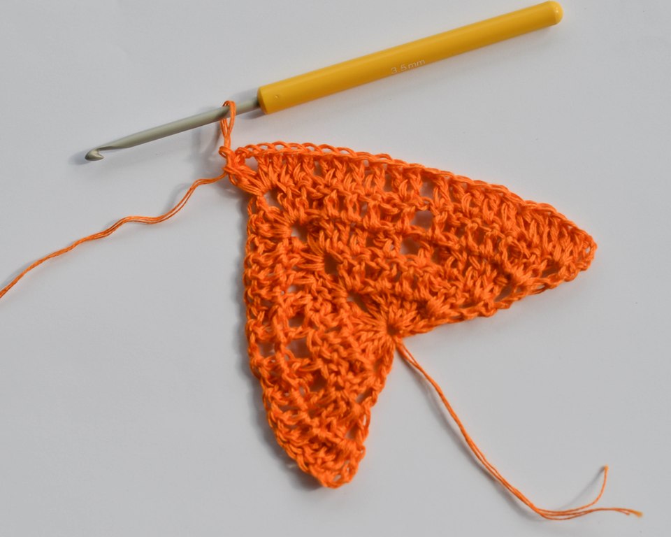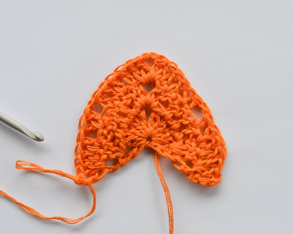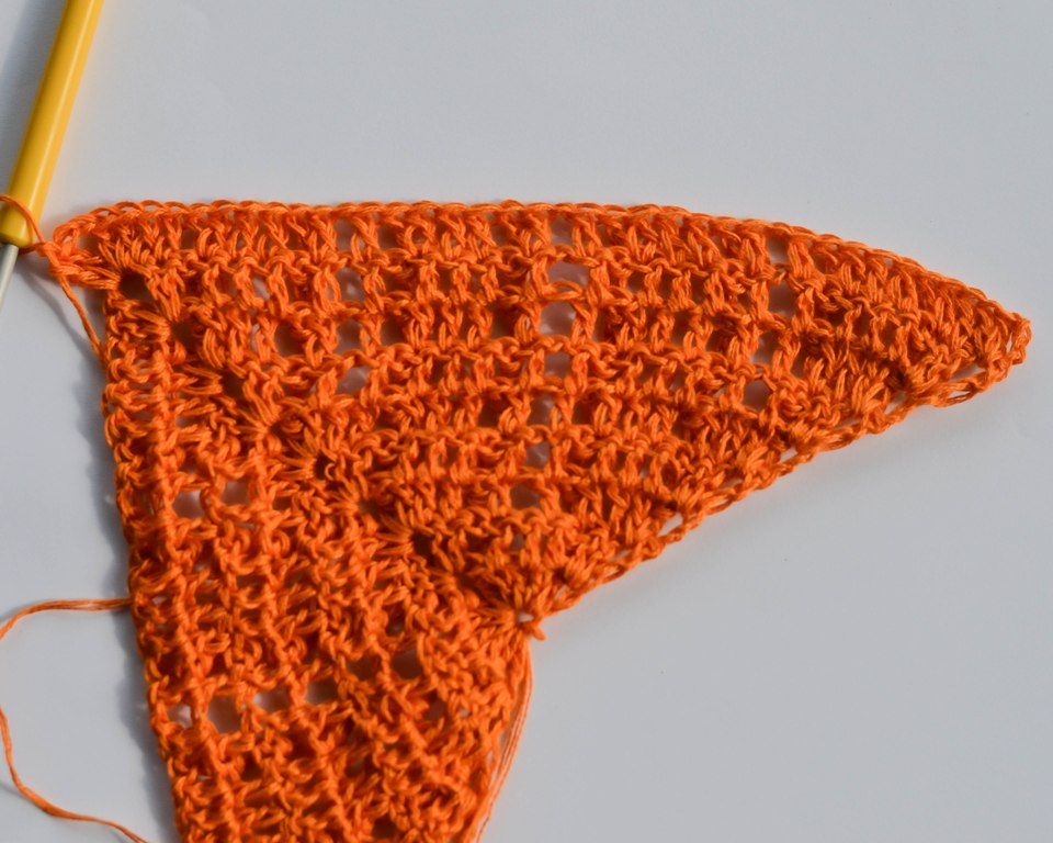 1 PRDS, 1 DS, 1 řo (přeskočit jedno oko), 1 DS, 1 PRDS, 2 DS do řo z předchozí řady, 1 řo, 1 DS