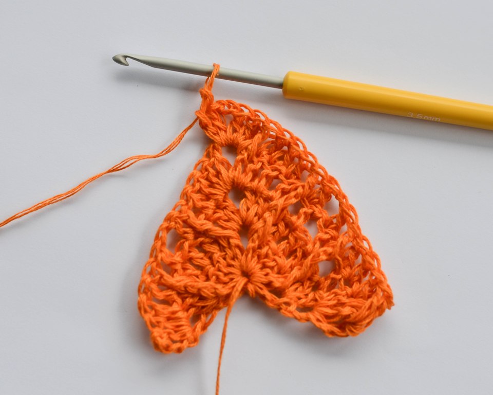 1 PRDS, 3 DS, 1 PRDS, 1 DS, 1 řo (přeskočíme oko), 1 DS, 1 PRDS, 3 DS, 1 PRDS, 2 DS do řo z přechozí řady, 1 řo, 1 DS