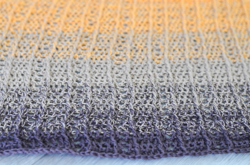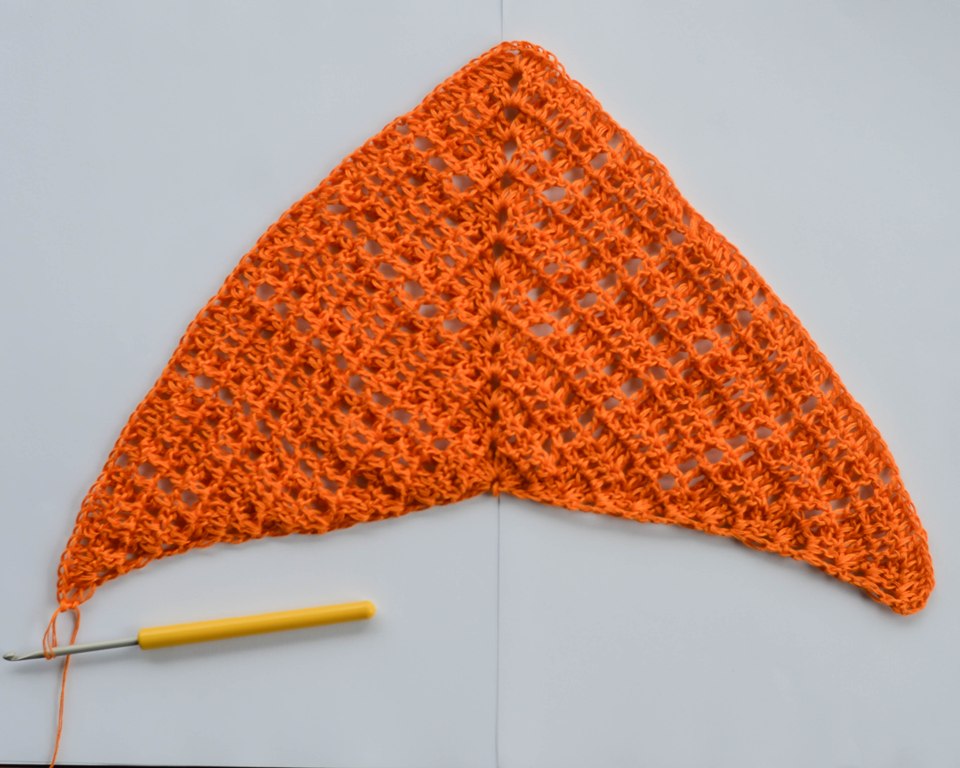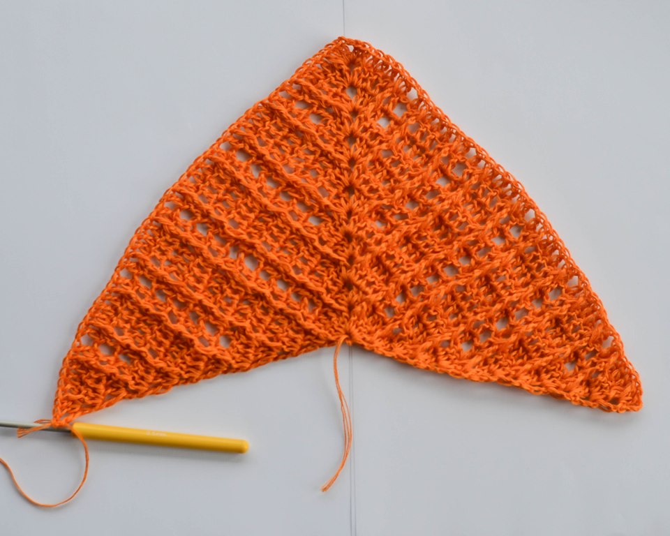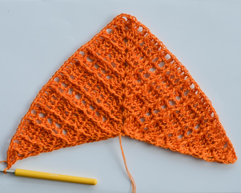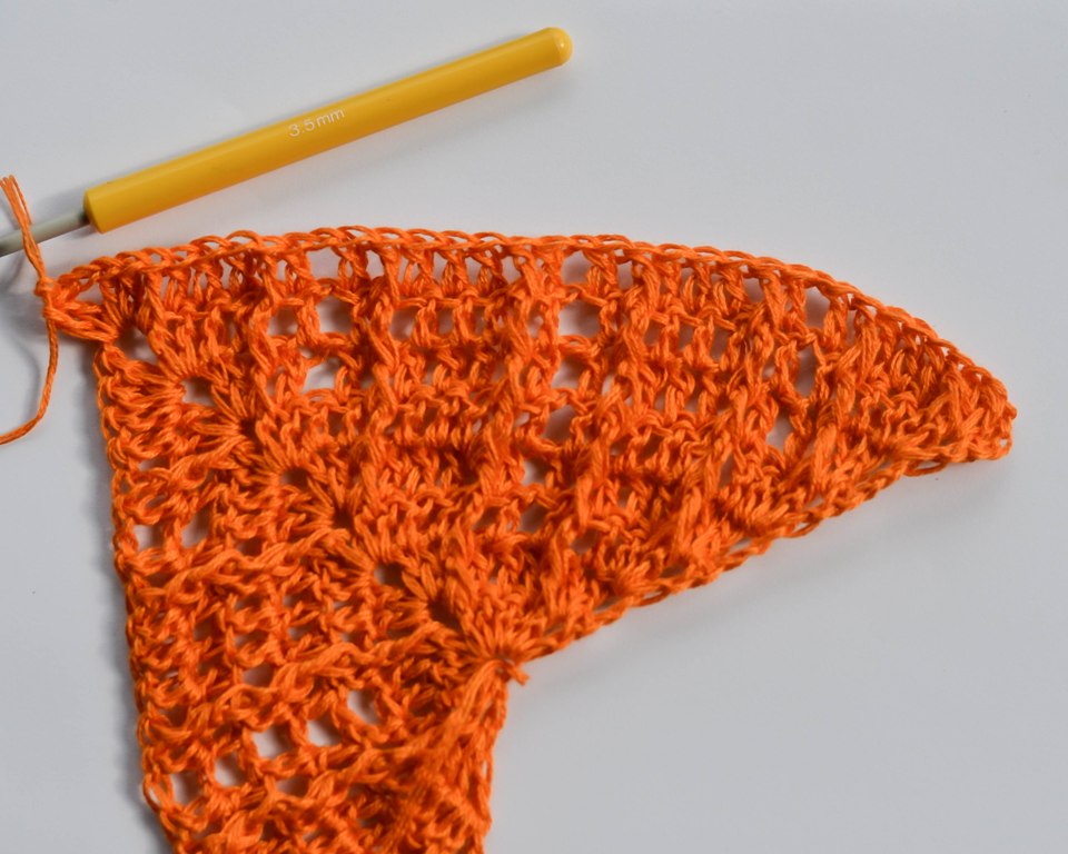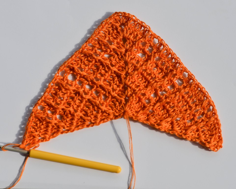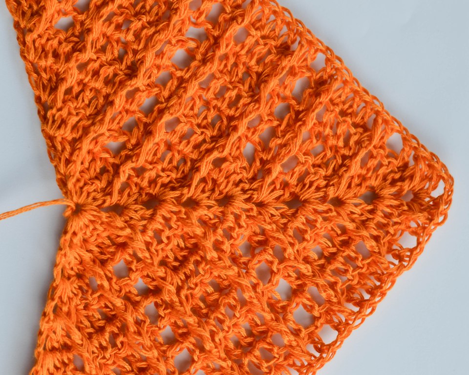 2 DS, 1 ZRDS, 1 DS, 1 řo (přeskočíme oko), 1 DS, 1 ZRDS, 2 DS, 2 DS do řo z přechozí řady, 1 řo, 1 DS